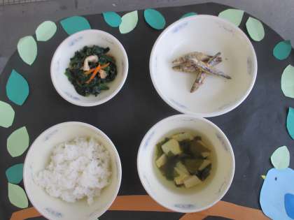 主食はごはん,主菜はきびなごのこはくあげ,副菜はほうれん草の煮びたし,汁物は若竹汁です。