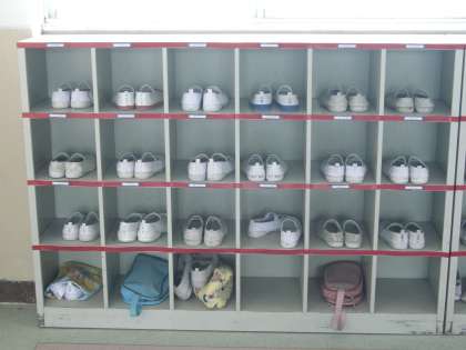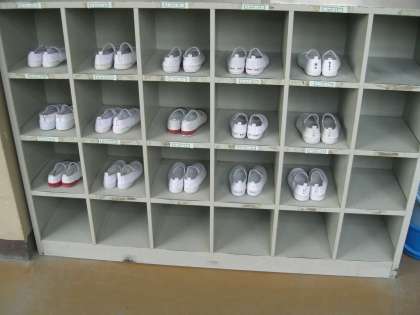 一方、下の写真は、ある高学年の教室のものです。担任の先生にお聞きすると、先生がきれいに並べておられるということでした。その意図は、子どもたちがこれを見て、いつか、靴を揃えることの大切さ、気持よさに気づき、みんなが自らやってくれることを待っているそうです。