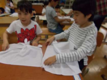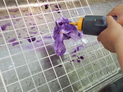事前に輪ゴムで模様となるところを縛り,染色液をかけました。