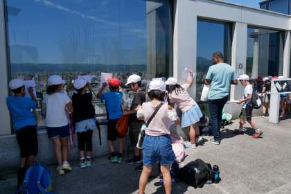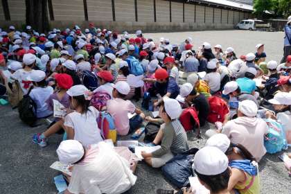 5月22日水曜日,三年生は社会見学で京都駅と西本願寺に行きました。京都市がどんな様子なのか,どんな特徴があるのか見に行きました。西本願寺では歴史的建造物に親しみながら,訪れている人々の様子を観察していました。京都駅では京都駅ビルの屋上から京都市をみて,東西南北の特徴を観察していました。「南の方角には山がないなぁ」「お寺がみえる」「道がまっすぐ」などと京都市の様子を詳しく観察し,気づいたことを一生懸命,記録していました。