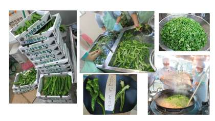万願寺とうがらしは,京都府舞鶴市発祥の京野菜の一つで,その大きさから「とうがらしの王様」とも呼ばれています。今が旬です。教室では「にがい」「ピーマンみたい」「ちょっとあまい」など声が聞こえてきました。