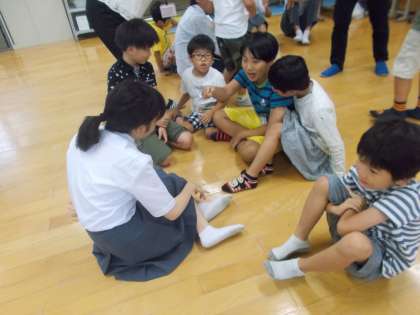 西院中学校の1組のみんなと小中交流会を行いました。「てとてとてと」の歌や「ハピネス」のダンスをすると,中学生から「懐かしい!」との声が。ほかに,お誕生月の歌を歌ったり,仲間集めゲームをしたりして楽しい時間を過ごしました。久しぶりに会えた中学生と笑顔でお話していました。