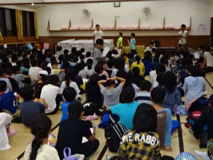 星の観察が終わり,90畳の部屋に戻り,今日一日の振り返りをしました。英虞湾を船で通り抜けたこと。グループのみんなで協力した野外炊事。美しい星空。いろいろな体験ができ,とても楽しい一日でした。野外炊事では,みんなテキパキ動き,グループごとの協力がすばらしく,良い活動ができました。
