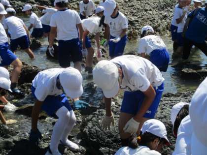 宮崎浜では,やどかりやカニ,うにのようにとがった針を持つ生き物などがいて,子どもたちは大喜びです。子どもたちは,一生懸命潮溜まりを覗き込み,生き物を探していました。