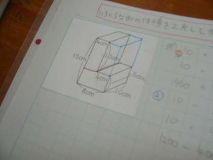 子供たちは複雑な面積の求め方の工夫を思い出し、2つに分けて体積を求めたり、直方体や立方体に見立てて体積を求め、そこから凹んでいる部分の体積を引いたりと、それぞれが考えて求めていました。