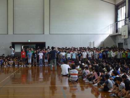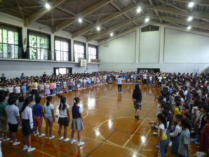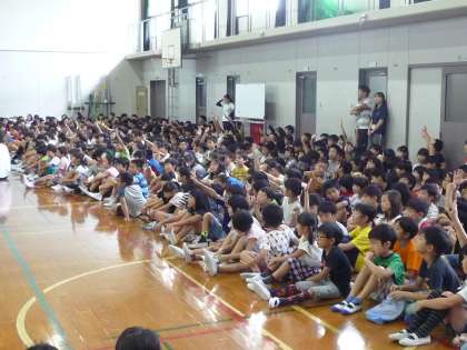 第2回目の全校音楽では「声の重なりの美しさを感じ取って,互いの歌声を聴き合って歌おう」をめあてに全校で学習しました。