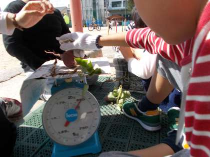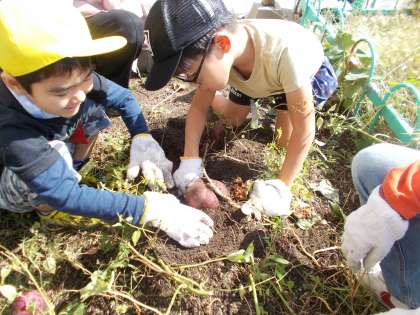 今日はいもほりをしました。春から大事に育ててきたさつまいもです。軍手をはめて準備万端。少し掘ると,大きいものから小さいものまでゴロゴロと土から出てきました。あったー!」「出てきた!」と大喜びの子どもたちでした。計量もして,チャンピオンは1.3キログラムもありました。