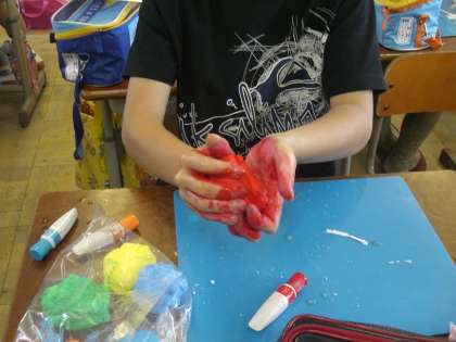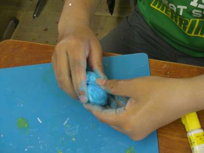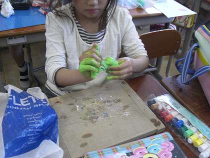 今日の図工は楽しく使おうの紙ねん土に色を混ぜる作業です。