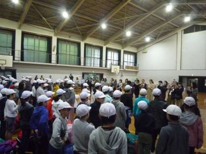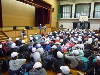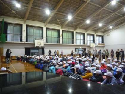 雨のため,体育館で出発式をしました。