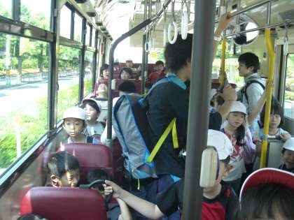遠足に行く途中のバスの中は,元気なみんなの声で大にぎわい。