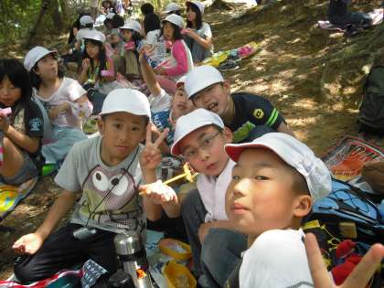 「お弁当おいし〜?」「おいし〜!!!!」子ども達の笑顔が輝いています。がんばって登った分だけお弁当がおいしいね。みんなで食べるお弁当は楽しいね。