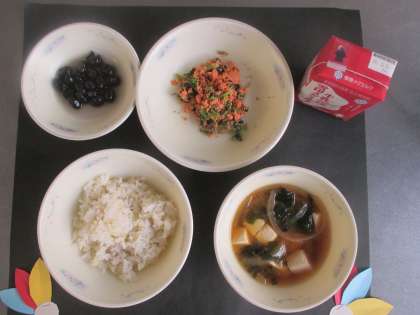 今日の給食は,麦ごはん・さけとだいこん葉のまぜごはん(具)・黒豆・みそ汁・牛乳でした。