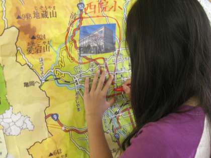 西院小学校の位置も確かめて,地図の中に学校の地図記号である「文」のマークを書きこみました。