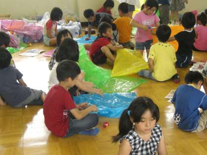 2時間目には、グループでポリ袋のつなげ方を工夫してカラーのごみ袋をつなげていろいろな形につくり変えています。