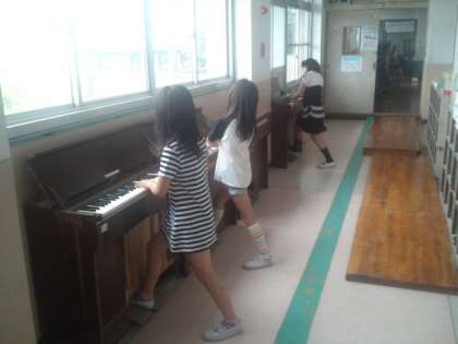 朝、校舎を回っていると、コンピュータ室の前に置いてある古いオルガンに、いつも子どもたちが集まっています。時には連弾で「ネコふんじゃった」を演奏する子たち、ピアノ教室で習っている難しい曲を一生懸命練習している子など様々です。足踏み式の旧型で、出にくい音があるものも。でも、子どもたちはそんなことはお構いなしで、とても楽しそうです。