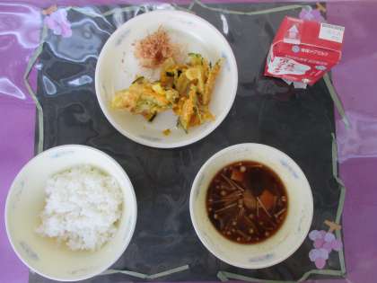 夏野菜のかぼちゃとゴーヤ,にんじん・ちくわをかき揚げにしました。3年2組の児童は「ゴーヤをへらしてください」という児童もいましたが,「おいしい」「おかわりほしい」という児童が多かったです。