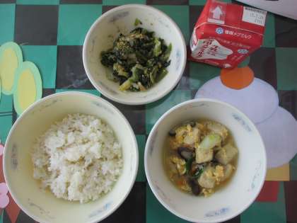 今日の給食は,麦ごはん・高野豆腐の卵とじ・ほうれん草とはくさいのごま煮・牛乳でした。