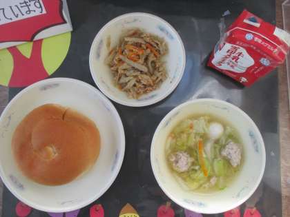 今日の給食は,バターうずまきパン・肉団子のスープ煮・ごぼうのソテー・牛乳でした。給食の手作りの肉団子がとてもやわらかいと大好評です。