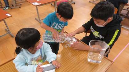 がありました。子どもたちは同じチームの友達と協力して,できるだけ正しく水をはかることができました。