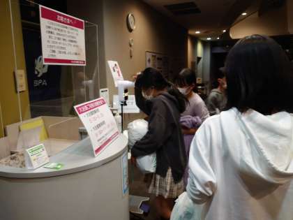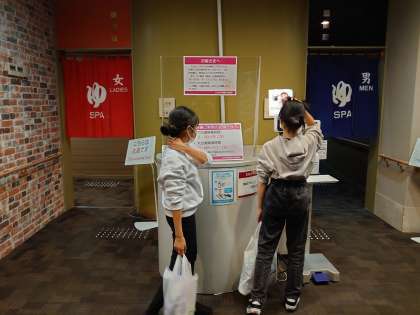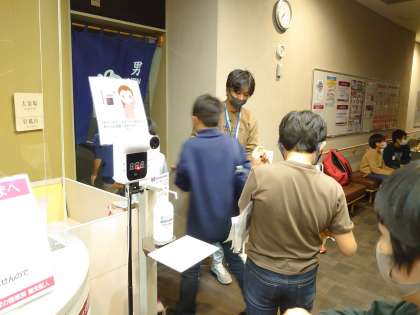 お風呂場の入口で、体温を測り、消毒をしてから入ります。