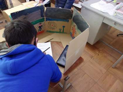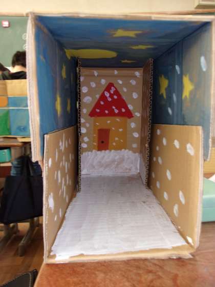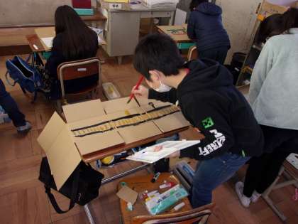 段ボール箱を開いたり立てたりして何に見えるか話し合い,想像を膨らませました。そして,絵の具で家や山,生き物などを描きました。画用紙とは違う素材に絵を描くことを楽しみ,すてきな作品を仕上げました。