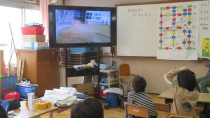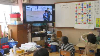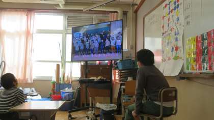 矢車学級では,11日(金)のトライタイムに6年生からのお返しムービーを見ました。「絆」という曲の手話はとても素晴らしく,特に矢車学級の6年生が映像に出てきたときには,1〜5年生の子どもたちから大きな歓声が沸いていました。また「西院レンジャー」のムービーもとても面白く,子どもたちは大喜びで6年生のムービーを見ていました。
