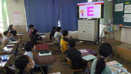 今日からUnit1の学習に入りました。まず,ABC song を歌いました。次に指導者のスモールと教科書のアニメーションでこの単元で学習する表現に慣れ親しみました。最後にはペアで自己紹介をやってみました。