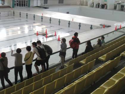 メインプールとサブプール,更衣室などを見学し,実際に子どもたちを連れて授業をするときのイメージを膨らましました。コロナのまん延状況にもよりますが,今年度は阪急電車を使いアクアリーナまで向かう予定をしております。プール学習だけでなく行き帰りの安全も確保し,授業を行っていきたいと思います。