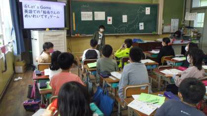 次の活動はLet's Gameをしました。「船長さんの命令です」ゲームとよく似たルールでLet'sが言われた後の動作は真似してもいいですが,Let'sを言われていない場合は動作の真似をしてはいけないというルールです。代表の子どもが前にでて指示を出して楽しく活動しました。