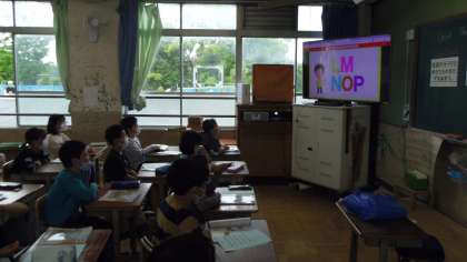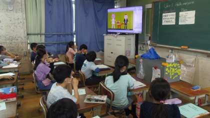 Unit1の5時間目の学習をしました。はじめにABC Songを歌いました。5回目なので子どもたちはしっかり歌っていました。次に教科書の電子教材を使ってチャンツを言いました。