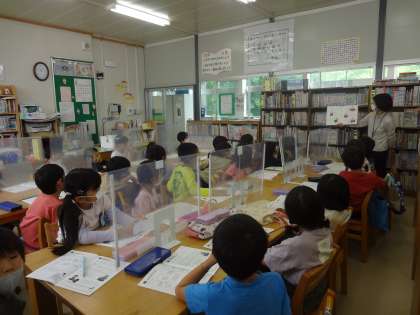 図書館オリエンテーションがありました。図書館司書の山田先生から,本の正しい扱い方や,貸出の仕方などを教えてもらいました。子どもたちはたくさんの絵本や図鑑に囲まれ,「いっぱいの本があって楽しい!」「どの本を借りようかな…」と興味津々でした。この日は2冊の本を借りています。教室でも,ゆっくり読むことができました。