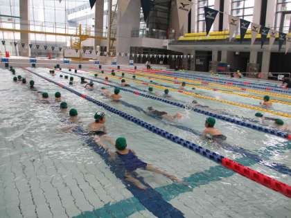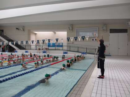プール内では,わにさんやかにさんになって水の中を楽しく活動しました。