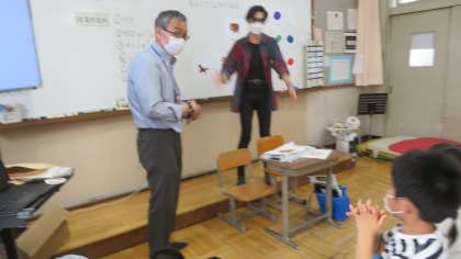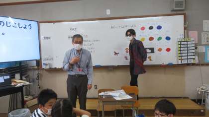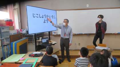 最初に先生たち全員の自己紹介を聞き,そのあと子どもたちが自己紹介で自分が言いたいことをALTの先生に聞き教えていただきました。どの子どもたちも自分の学年以上の文を話すことができ,素晴らしい自己紹介でした!