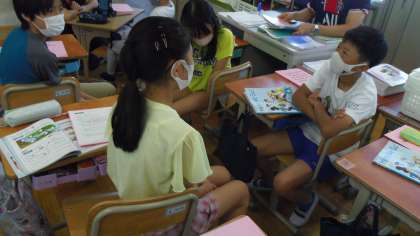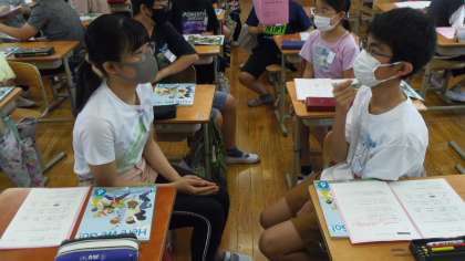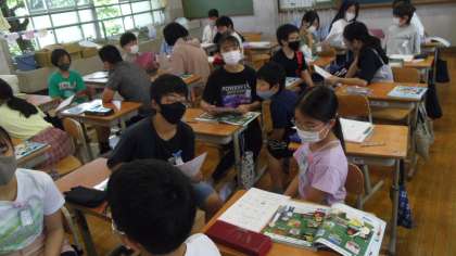 授業の後半は再びぺアトークをしました。互いに季節と行事の紹介をしました。西院校区の春日祭りを紹介している子どもがいました。相手の目を見て相手に伝わるように意識してぺアトークをしている子どもがいました。そのあとで各自がペアに紹介した季節と行事をワークシートや教科書をみて書き写す活動をしました。