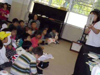 今日は,読み聞かせサークルのイベントがあり,本が大好きな2年生が参加しました。行ってみると,すぐに紙皿やペットボトルのふたを使ってでんでんだいごを作りました。手首を回すといい音が鳴るので二人ともお気に入りで,鳴らしながら踊っていました。その後は,絵本の読み聞かせや紙芝居をしてもらい,真剣な顔で聞いていました。たぬきやさるも(着ぐるみ)登場して大さわぎ。楽しい時間を過ごしていました。家に帰ったら,でんでんだいこで演奏会をするそうです。にぎやかでしょうね?