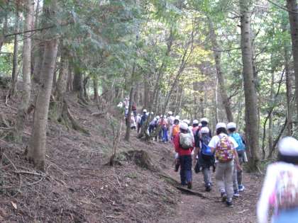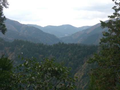 途中に何箇所も難所がありましたが、少し平らで、見晴らしのきくところもありました。そこからは、はるか遠くに花脊山の家を見ることができました。写真の稜線がY字に交わったあたりに赤く小さな屋根が見えるのが山の家です。