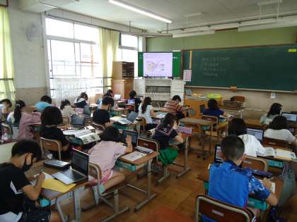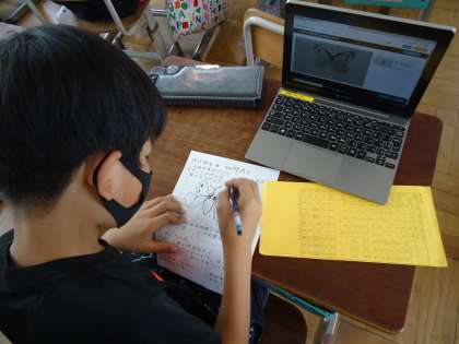 今日はモンシロチョウの体のつくり方を学習しました。生きているモンシロチョウはじっとしていることはできなくて,細かいところまで詳しく見られませんでした。そこで,京都教育大学生態学研究室が作成したモンシロチョウの3Dモデルを作って学習しました。大きくしたり,回転したりして肉眼では見えないところまでじっくり観察でき,教室は静寂と歓声の波に包まれていました。