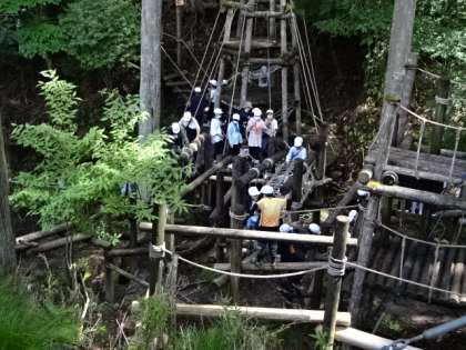 「冒険の森」でのアスレチックに,子どもたちは夢中になって取り組んでいます。