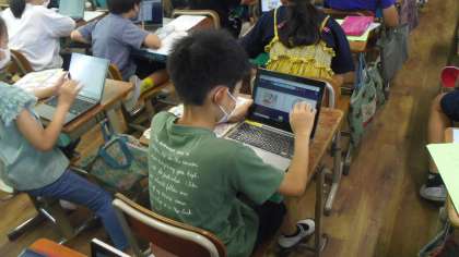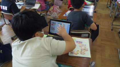 今日はUnit4の3時間目の学習をしました。はじめにチャンツを言いました。3回目で子どもたちも言い方に慣れてきているようです。次にロイロノートで自分の日課の時間を時計に書込みました。最後に書き込んだ時計を見せながら時刻と日課を英語で伝え合いました。写真はコンピュータを使って時計の針を書き込んでいる様子です。
