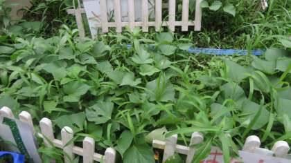 サツマイモも葉を茂らせています。