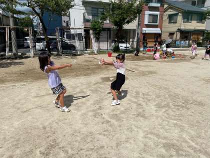 水遊びでは,暑い中だったので,自分にも浴びるように水をかけている様子も見られました。
