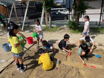 「たくさん掘って,水を入れよう。」と協力して作っていました。
