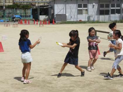 また、水遊びでは、全身ぬれてしまっている人もいましたが、それでも笑い声はたえず 体いっぱい運動場で水をかけ合い走り回る姿が見られました。