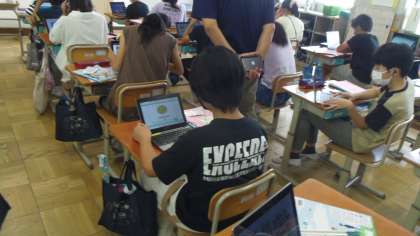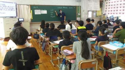 今日は第3時間目の学習をしました。はじめに歌を歌いました。3回目なので少しずつ歌えるようになってきています。次にスモールトークをしました。今日は西院中から英語科の先生が来てくださっていますので,その先生の夏休みに行った場所,したことを話してもらいました。子どもたちは行った場所やしたことが大体理解できていたようです。その次にデジタル教科書を使って今まで学習してきている表現の練習をしました。それから練習した表現を使ってぺアトークで夏休みについて伝え合いました。