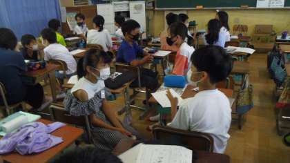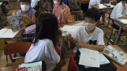 授業の後半はペアで起きる時刻,朝食の時刻,夕食の時刻,寝る時刻をたずね合いました。表現に慣れていない児童もいましたが,ジェスチャーを使って伝え合いました。