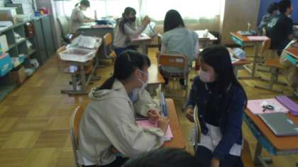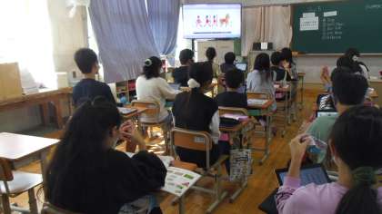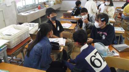 今日はUnit5の5時間目の学習をしました。有名人の名前,職業,性格などをペアで伝え合いました。はじめに各自のギガ端末をつかって表現に慣れ親しみました。次に班の中でペアをきめて互いに伝え合いました。