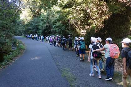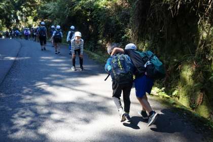登り道はとてもつかれますが,友達と励まし合い,みんなで頂上までたどり着きました。