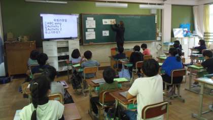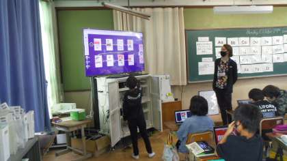 今日はUnit6の4時間目の学習をしました。今日はALTの先生と一緒に学習しましたはじめにABCソングを歌いました。歌の前にはカードを使ってアルファベットの読み方をALTの先生と確認をしました。次にコンピュータを使って班でアルファベットクイズをしました。文字数や含まれるアルファベットをヒントとして英語で伝え合ってクイズをしました。