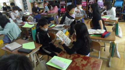 最後に教科書を使って好きな色のアルファベットをクイズ形式で伝え合いました。