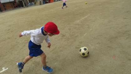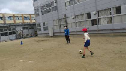 前から転がってきたボールをシュートしたり、後ろから転がってきたボールをシュートしたりなど、様々なシュートに挑戦しています。今回は前から転がってきたボールを止めてシュートをすることも行いました。少しずつボールの扱いが上手になってきています!